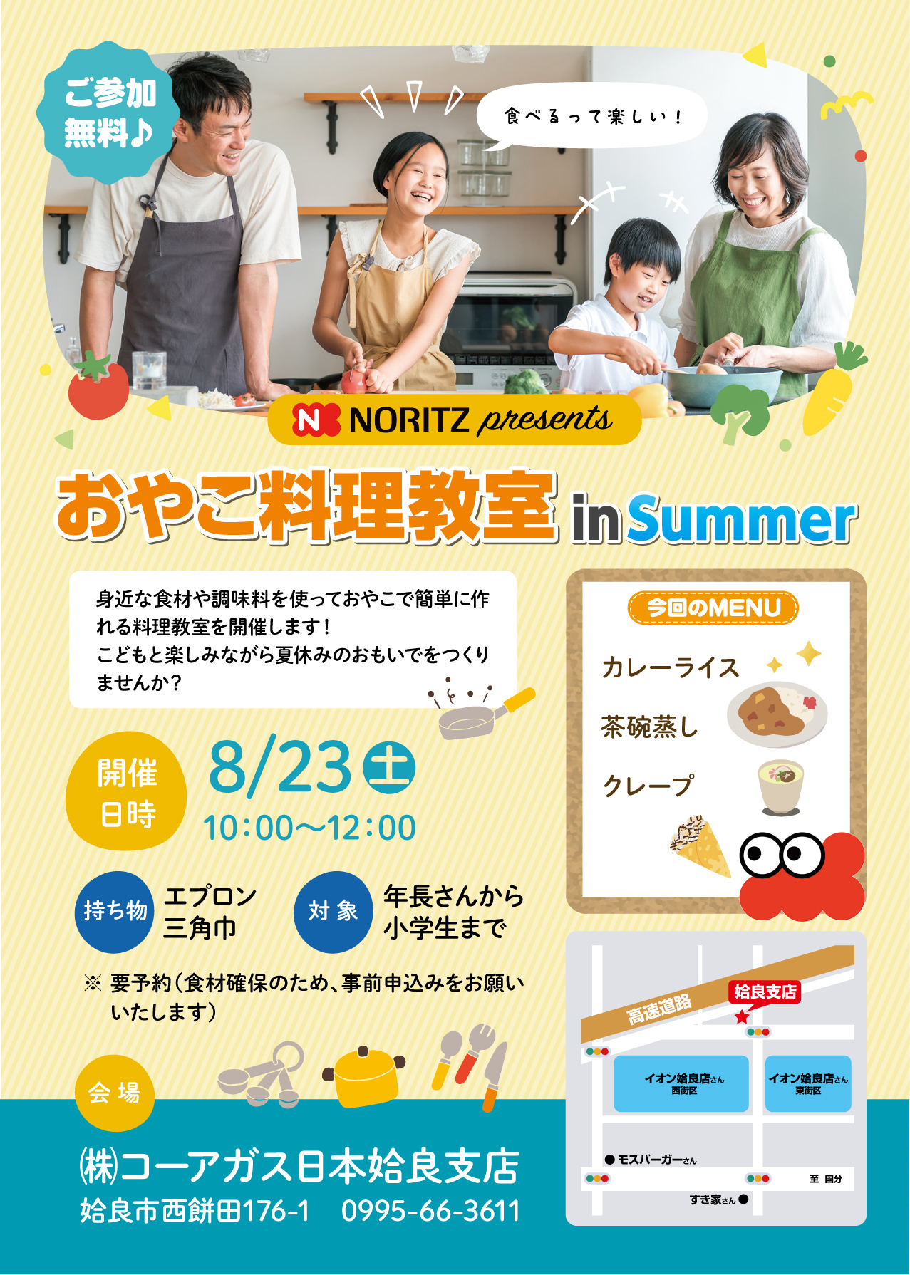 【株式会社ノーリツ × 株式会社コーアガス日本 共同企画】「おやこ料理教室 in Summer」を姶良支店で開催いたします。