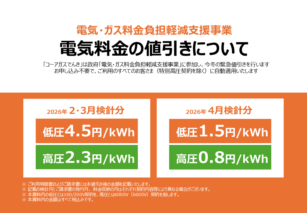 「コーアガスでんき」は、政府の電気・ガス料金支援「電気・ガス料金負担軽減支援事業」へ参加し、お客さまへ下記のとおり値引きを行います。
